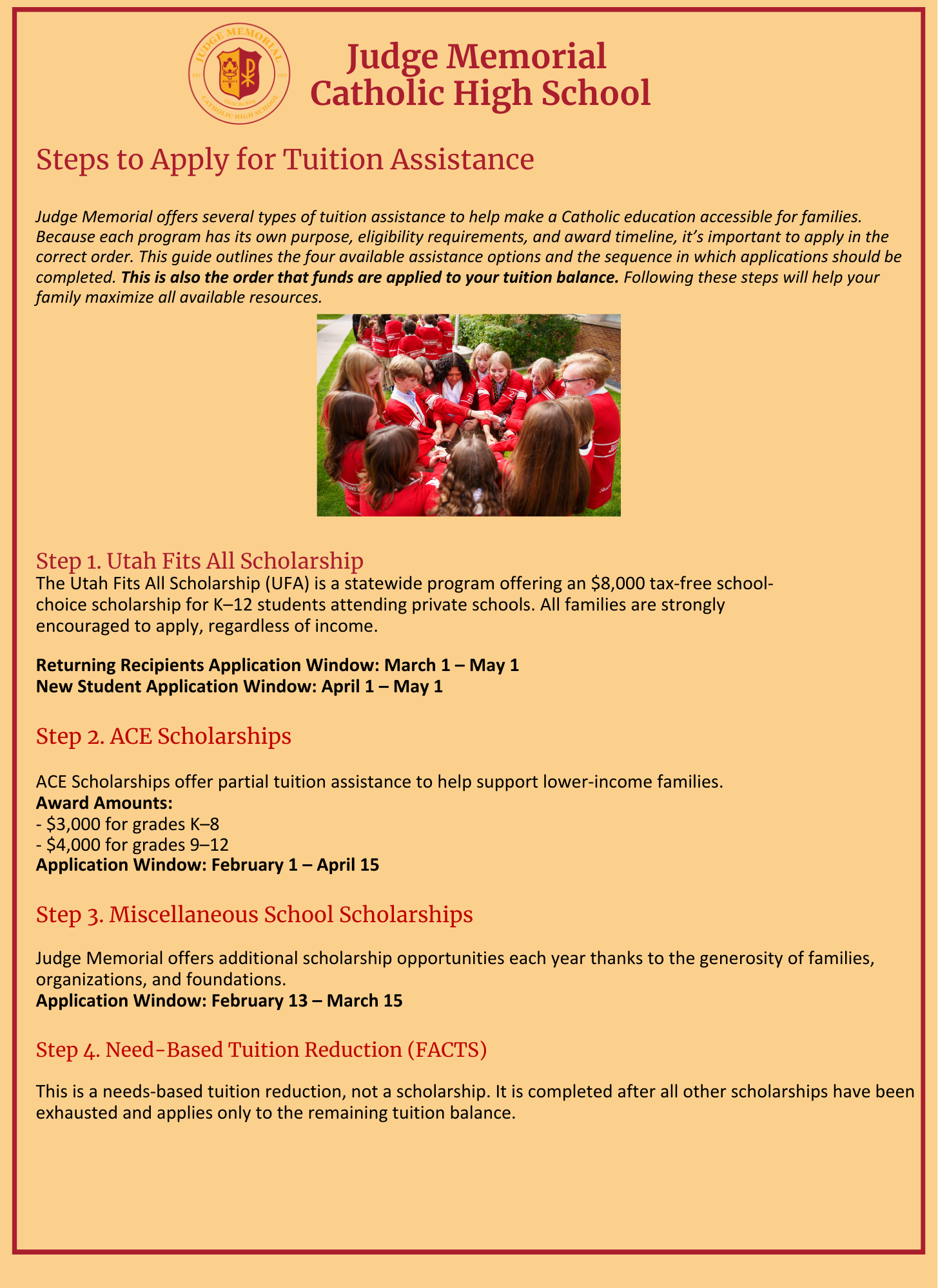 We are proud that 66% of Judge Memorial families receive some level of financial aid. We encourage all families to learn more about making a Judge education accessible. Click the Tuition Assistance Steps button below for a guide with application links that outlines the steps to apply for tuition assistance.